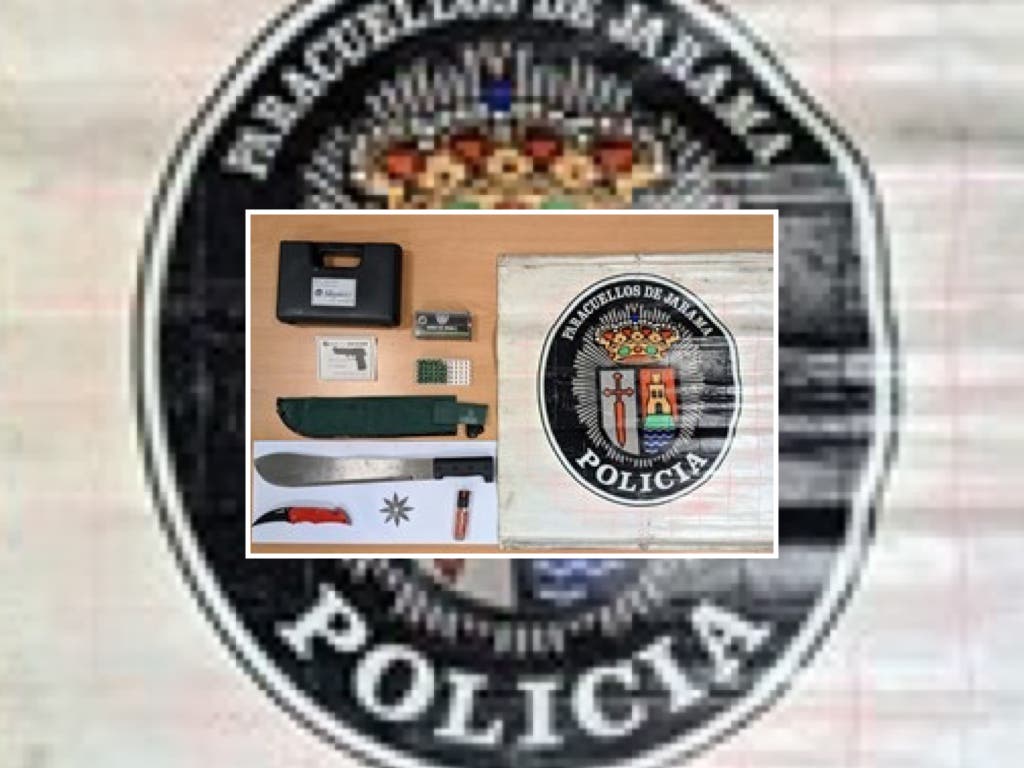 Los agentes municipales procedieron a registrar la vivienda localizando en su interior un machete de grandes dimensiones, una navaja, un spray de defensa, la caja de una pistola con munición de fogueo y un shuriken o estrella ninja.