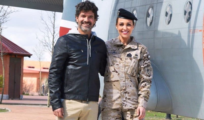 La actriz Paula Echevarría, acompañada del actor Rodolfo Sancho, se ha enfundado el uniforme militar de la Brigada Paracaidista (BRIPAC) en su base de Paracuellos de Jarama.