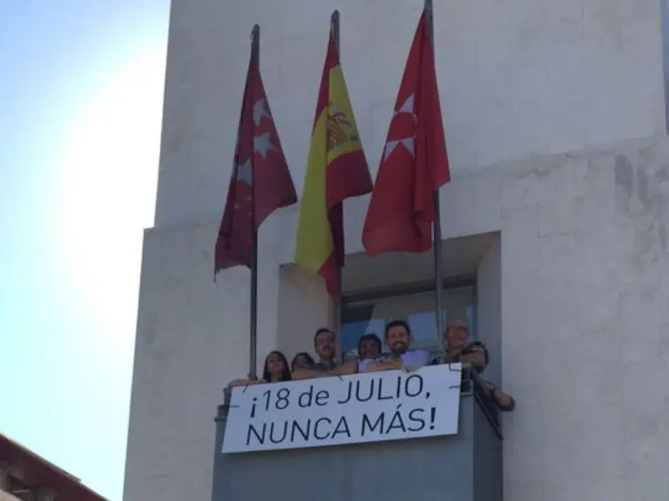 El Ayuntamiento de Rivas se ha sumado hoy a una campaña de la Asociación para la Recuperación de la Memoria Histórica que recoge el rechazo de las instituciones al golpe de estado franquista de hace 80 años, colocando en el balcón de alcaldía un cartel con el lema ¡18 de julio, nunca más!.