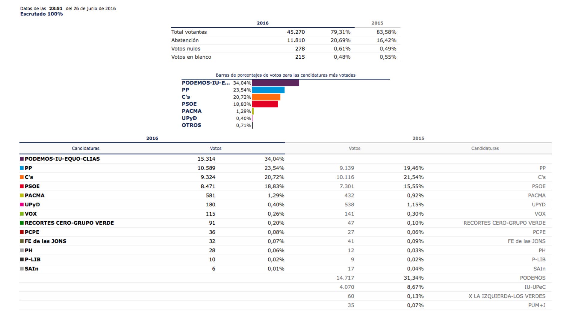 En Rivas-Vaciamadrid, con el 100 por ciento de votos escrutados, Unidos Podemos ha revalidado la primera fuerza política con el 34,04 por ciento de los votos, mientras que el PP consigue el 23,54, C's el 20,72 y PSOE el 18,83 por ciento