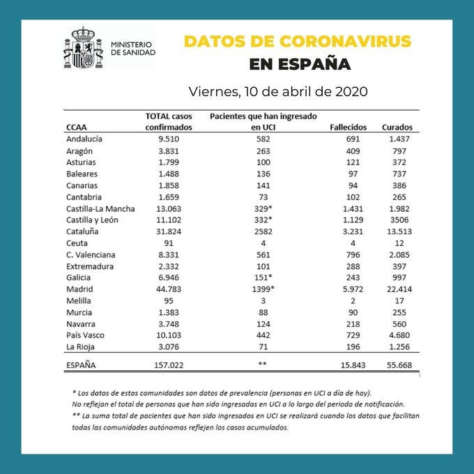España ha registrado este viernes, 10 de abril, otros 605 fallecidos por coronavirus en las últimas 24 horas, la cifra más baja de muertos diarios desde el pasado 24 de marzo, cuando se registraron 514 defunciones, según los últimos datos ofrecidos por el Ministerio de Sanidad, que sitúa en 15.843 el número de personas fallecidas.