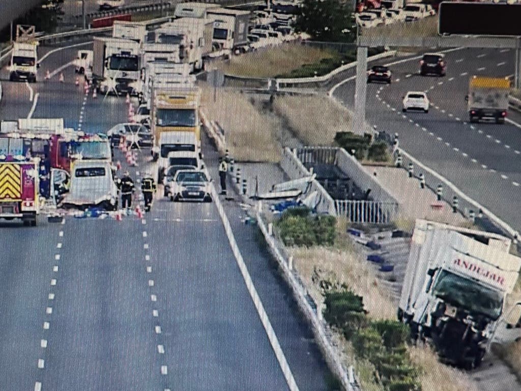 Un camión ha perdido parte de su carga tras chocar con una furgoneta en el kilómetro 33 de la M-45, en el cruce con la M-50, en San Fernando de Henares.