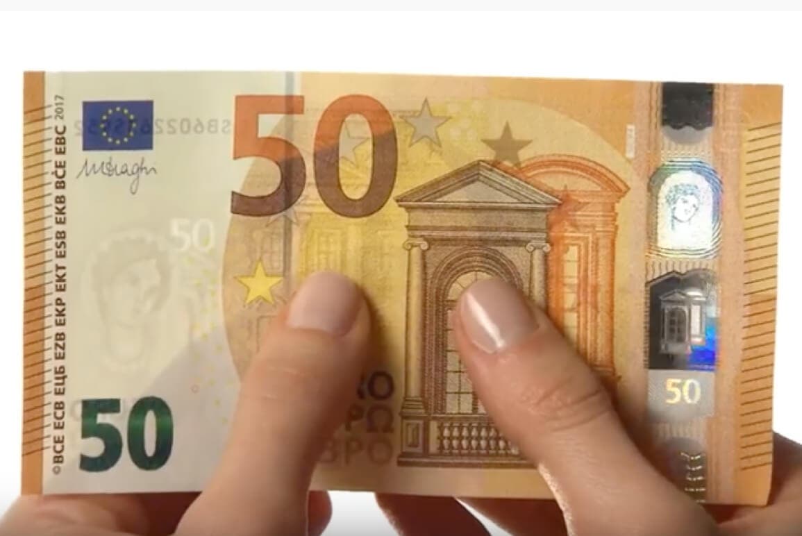 Por último, al girar el billete, la banda plateada muestra un retrato de Europa en una ventana transparente y el número verde esmeralda produce un reflejo metálico que se desplaza verticalmente.