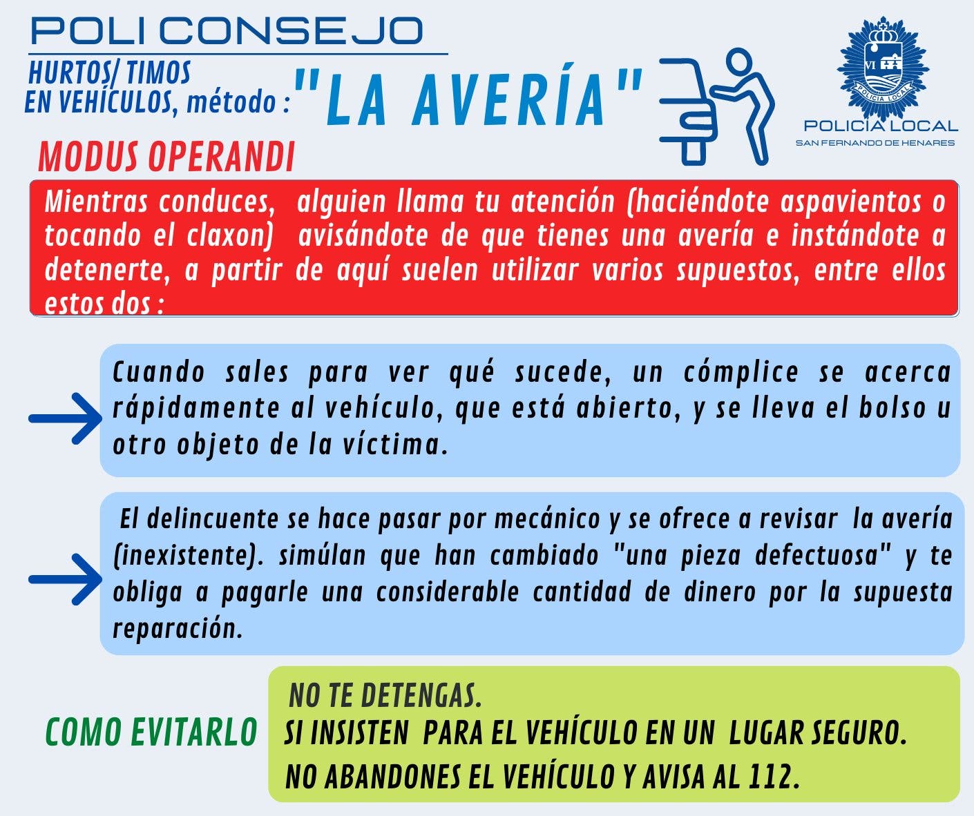 La Policía Local de San Fernando de Henares ha alertado a través de las redes sociales de que en los últimos días ha recibido avisos por intentos de hurtos o timos a conductores con el método de «la avería». «Los malos suelen escoger a personas de edad avanzada como sus víctimas», ha explicado el cuerpo municipal.