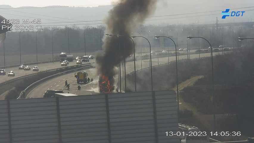 El incendio de un camión portacoches ha provocado este viernes, sobre las 14 horas, importantes retenciones de tráfico en el kilómetro 29 de la M-45, a la altura de San Fernando de Henares, donde el conductor ha parado tras darse cuenta del incendio.
