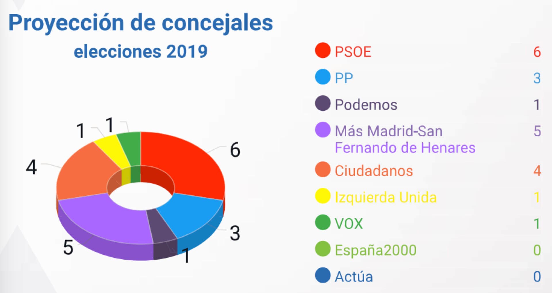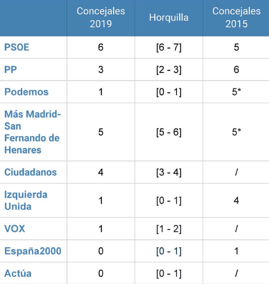 Con estos datos la izquierda obtendría 13 concejales y la derecha 8, se reduciría la diferencia entre ambos bloques ya que actualmente son 14 y 7, pero no habría sorpasso de bloques. Sin embargo, el PSOE podría intentar sumar con Ciudadanos y podrían llegar a los 11 concejales y, por primera vez en la historia de la localidad, la derecha entraría en el gobierno de San Fernando de Henares.
