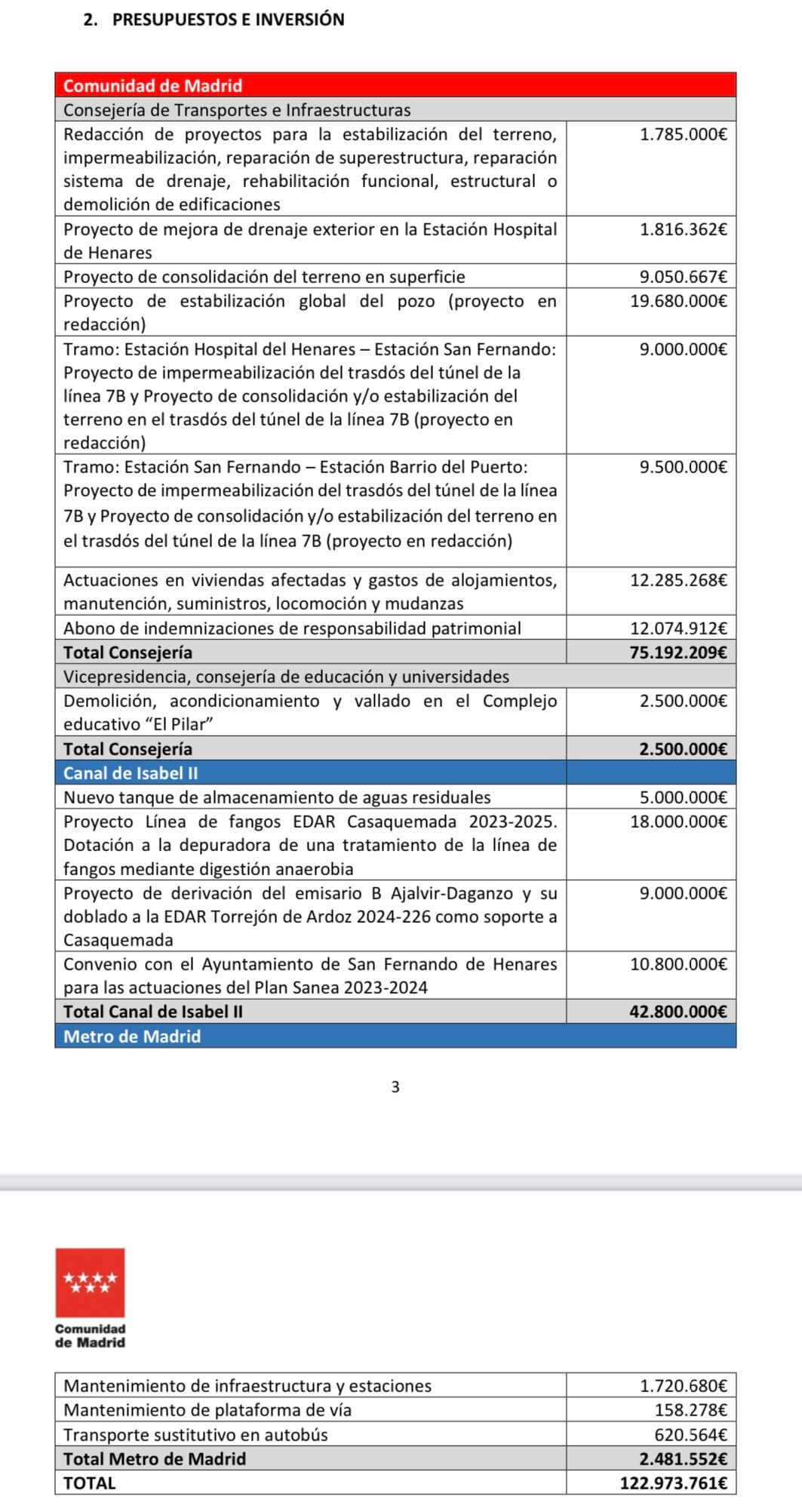 Del mismo modo, la Comunidad de Madrid está tramitando los expedientes de responsabilidad patrimonial con los que se indemnizará a los propietarios de los inmuebles, para lo que se destinarán más de 12 millones de euros, para los 76 expedientes de responsabilidad patrimonial abiertos ahora, al mismo tiempo que iniciará los trámites correspondientes para compensar al Ayuntamiento por los daños ocasionados en calles, aceras y otros elementos públicos.