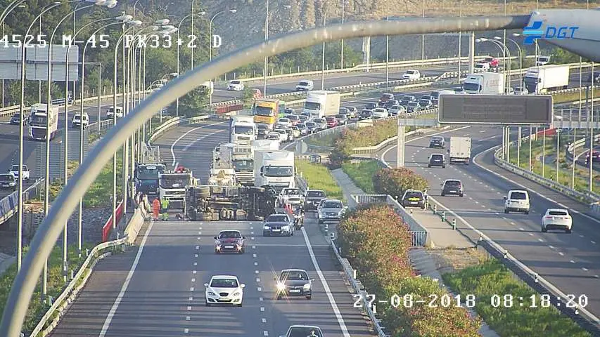 El vuelco de un camión a la altura del kilómetro 33 de la M-45, en San Fernando de Henares, ha provocado importantes retenciones desde primera hora de este lunes, según ha informado el 112 de la Comunidad de Madrid y reflejan las cámaras de la DGT.