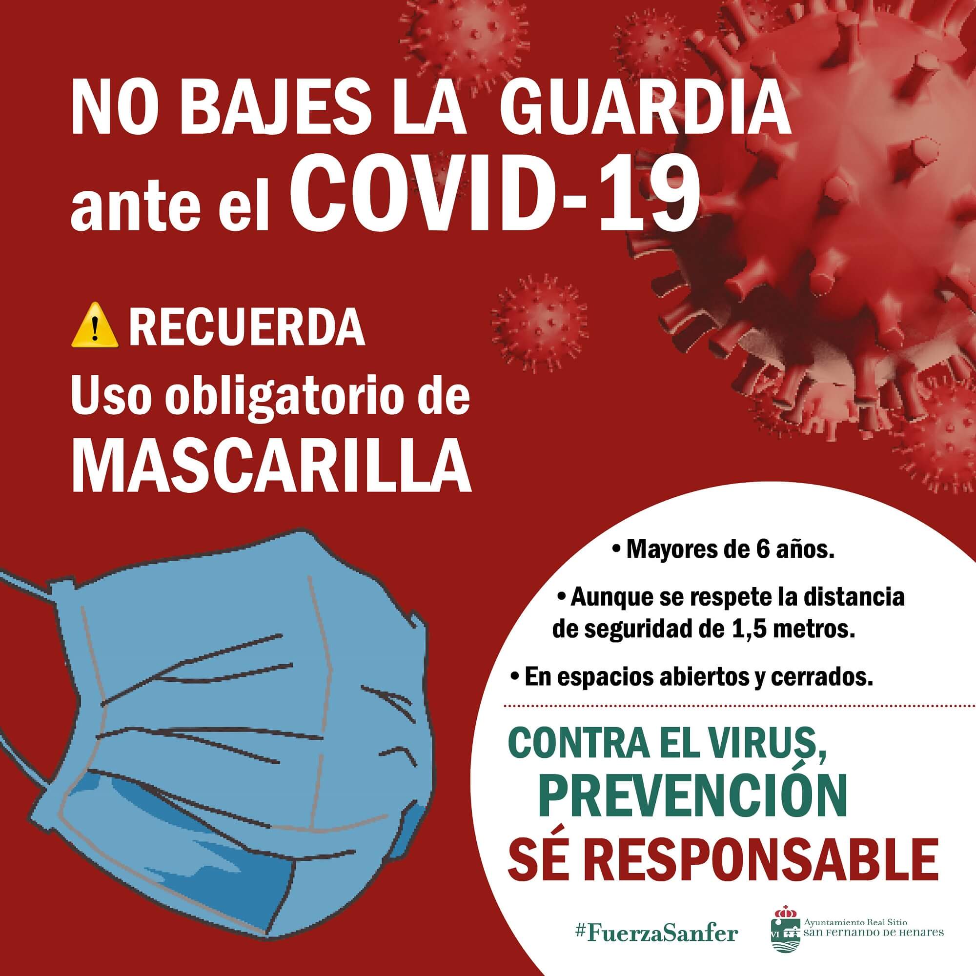 El Ayuntamiento de San Fernando de Henares, con la implicación de varias áreas municipales, ha puesto en marcha una campaña de concienciación ciudadana recordando, una vez más, la importancia de cumplir, escrupulosamente, con las medidas de seguridad e higiene marcadas por las autoridades sanitarias, como el uso obligatorio de mascarillas o el lavado frecuente de manos.