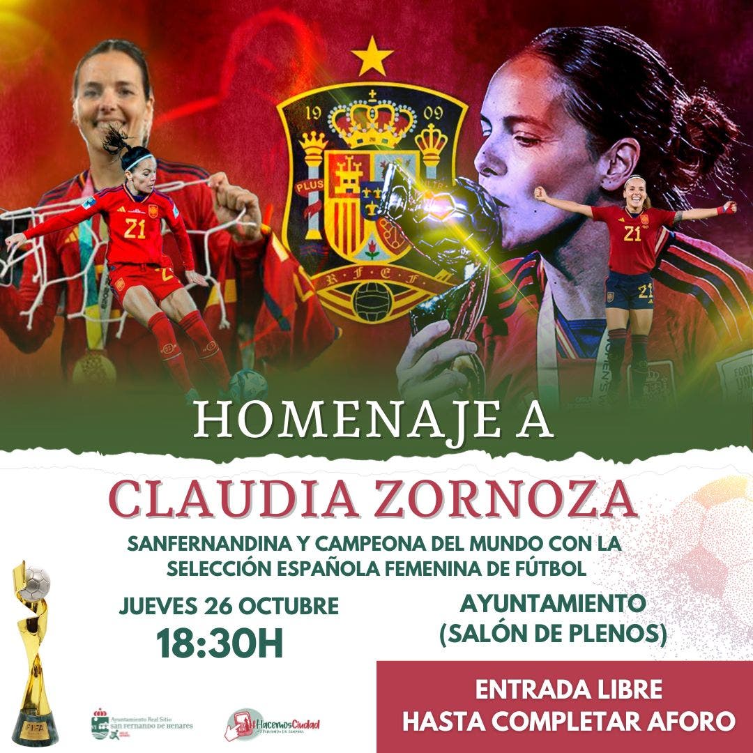 El Ayuntamiento de San Fernando de Henares rendirá homenaje a Claudia Zornoza, vecina de la localidad y Campeona del Mundo con la Selección Española Femenina de Fútbol.
