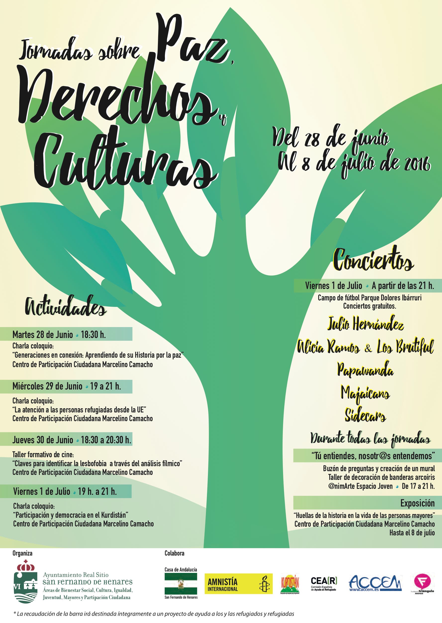 Con estas Jornadas, se ha pensado en diferentes temáticas sociales como la lesbofobia, la situación de los refugiados en la UE, la memoria histórica, la represión que sufre al pueblo kurdo o la invisibilización de la cultura LGTBI; todas las actividades culminaran en un concierto gratuito que tendrá lugar el viernes 1 de julio a partir de las 21:00 de la noche en el Campo de Fútbol del Reciento Ferial de San Fernando de Henares.