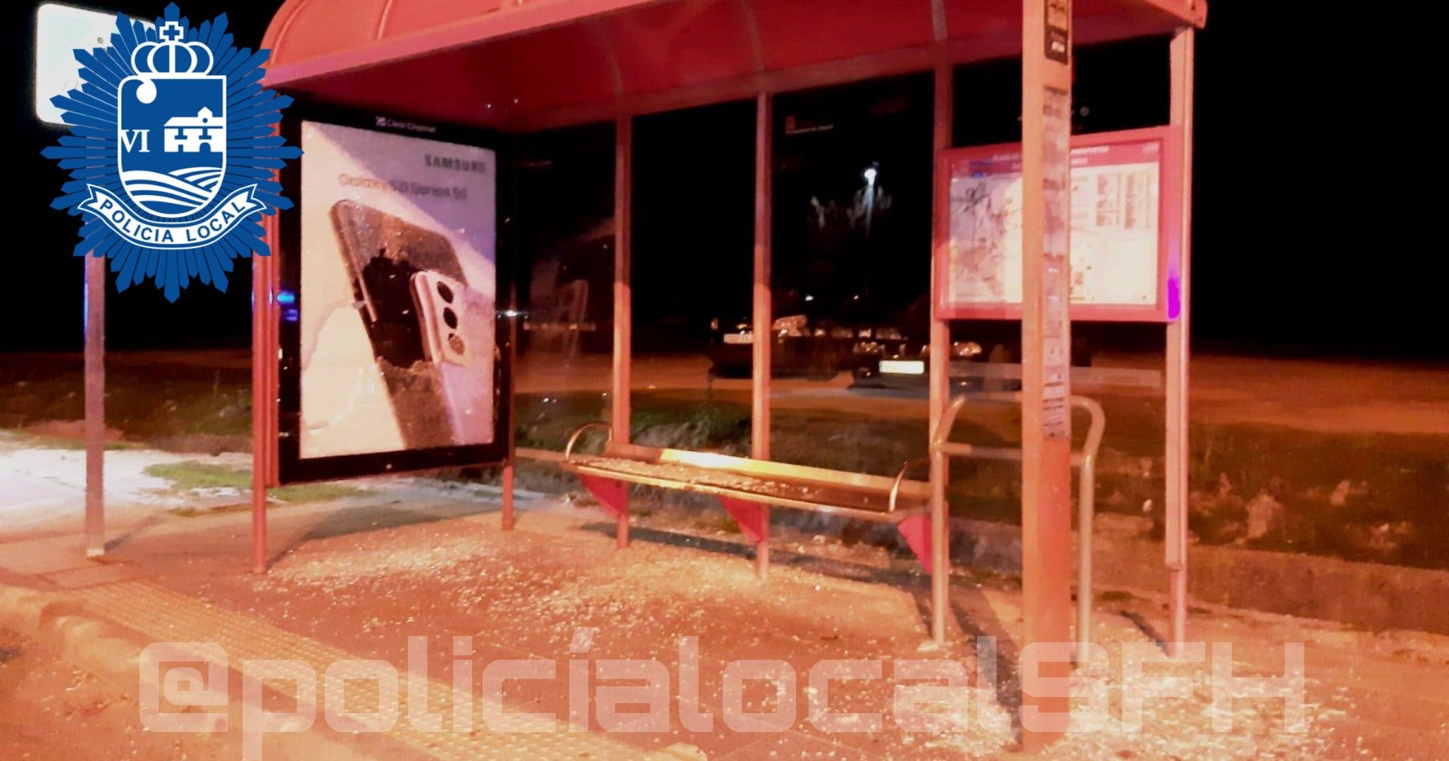 Como se puede comprobar en las imágenes compartidas por la Policía Local, los implicados destrozaron toda la cristalería de la marquesina, incluida la del panel de publicidad.