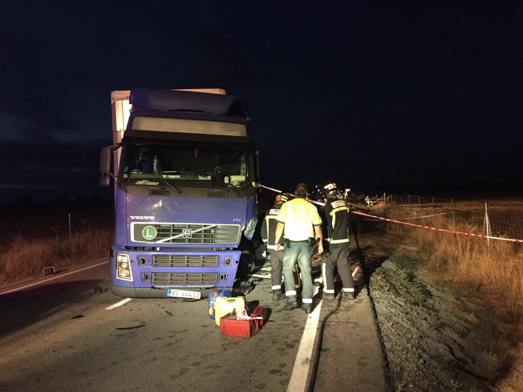 Cinco dotaciones de bomberos de la Comunidad de Madrid se trasladaron al lugar del accidente para excarcelar el cuerpo de la víctima de los restos del vehículo, y también para extraer los 400 litros de combustible del camión.