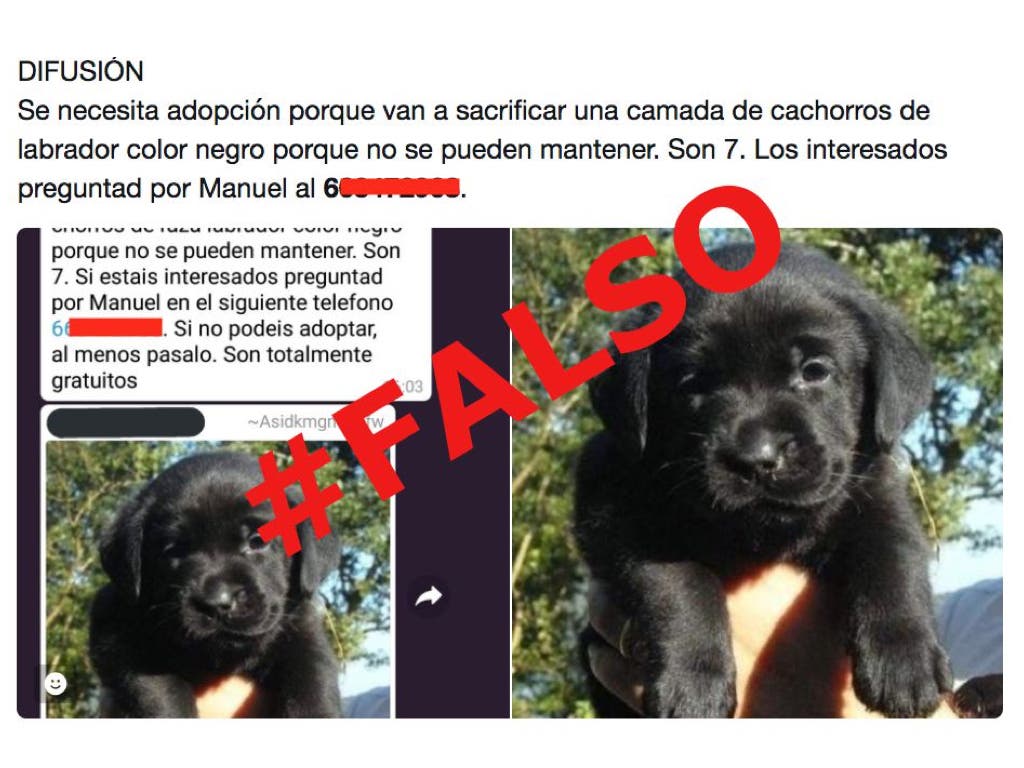El mensaje, acompañado de una foto de los perritos, dice: «Por favor difundir. Van a sacrificar una camada de cachorros de raza labrador color negro porque no se pueden mantener. Son 7. Si estáis interesados preguntad por Manuel en el siguiente teléfono. Si no podéis adoptar, al menos pásalo. Son totalmente gratuitos».