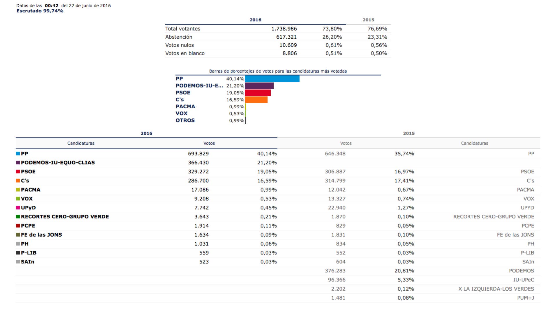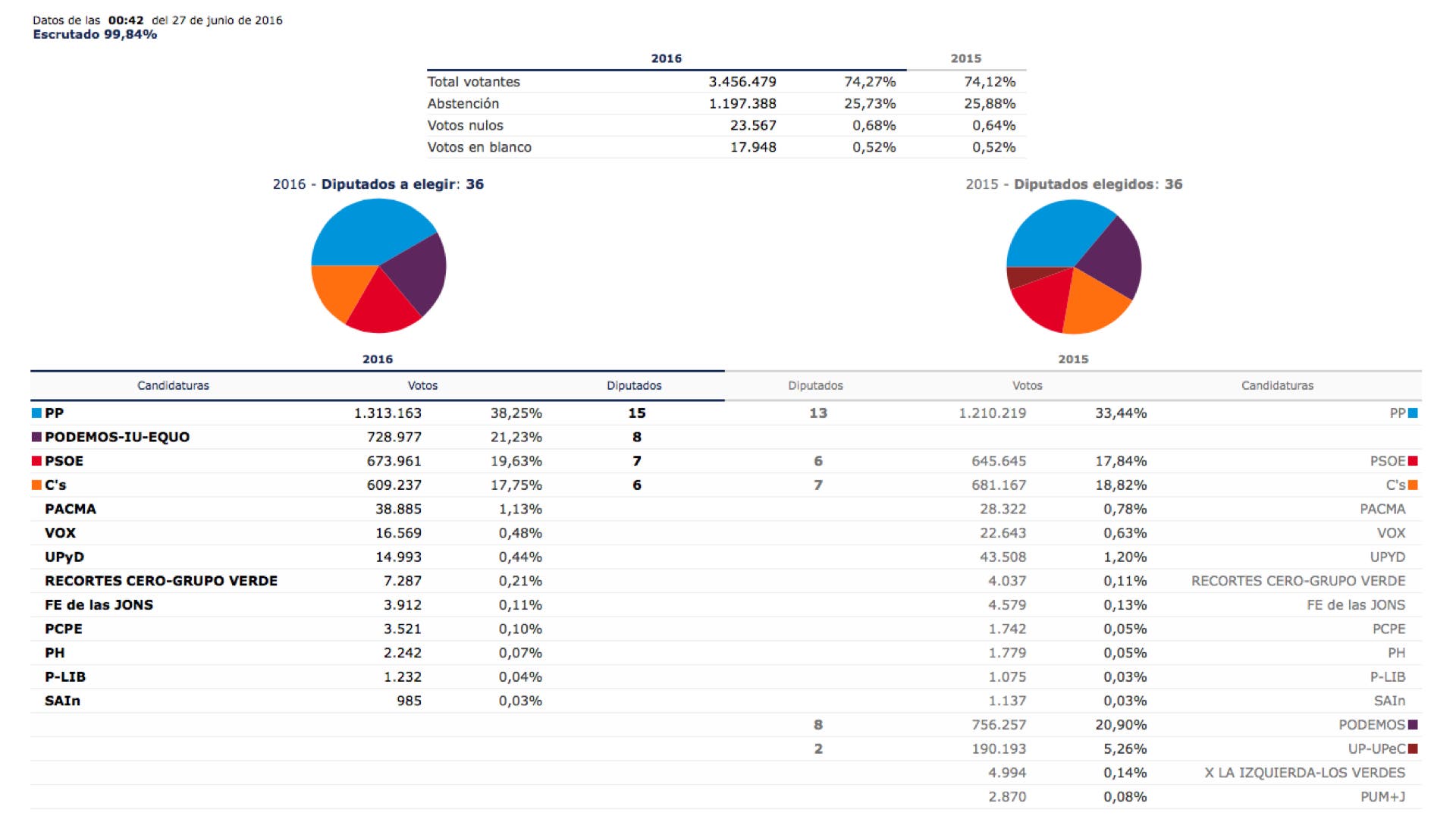 Comunidad de Madrid: El PP queda primero y gana apoyos respecto a 2015, Unidos Podemos segundo partido más votado y el PSOE queda tercero mejorando su resultado