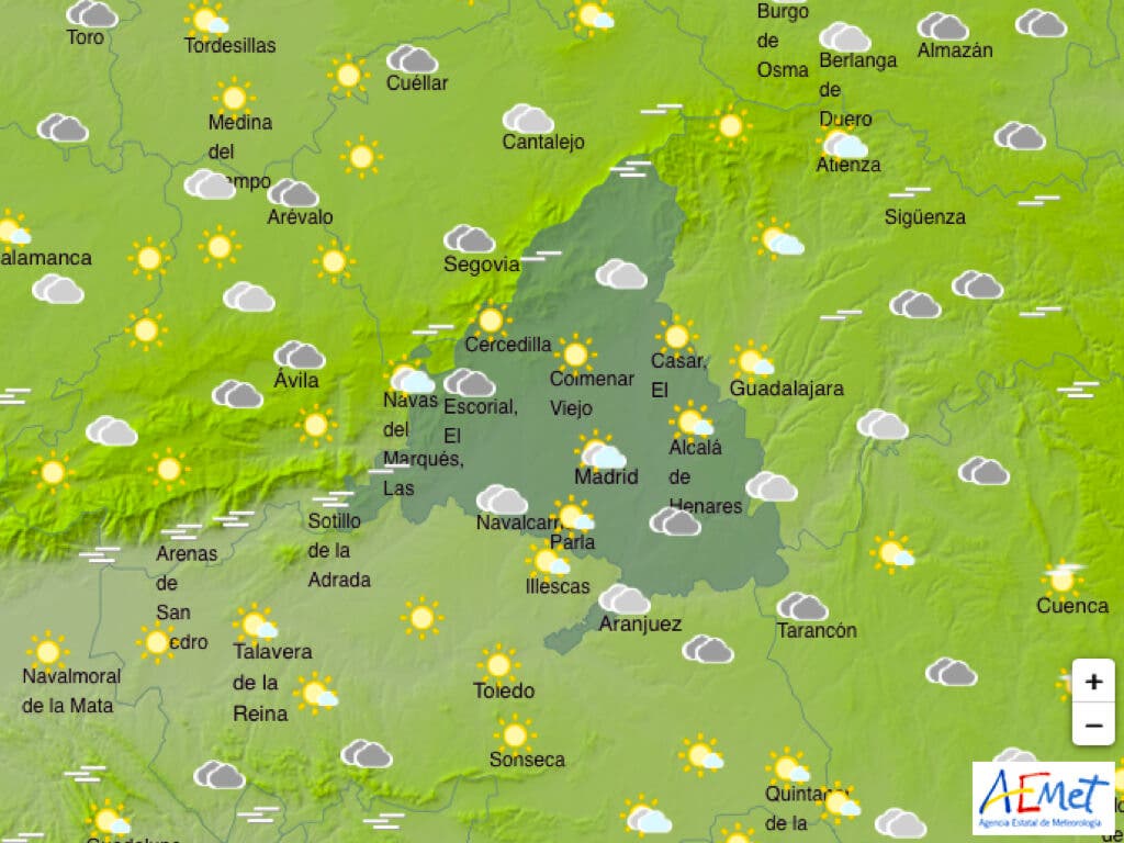El domingo en la región de Madrid, en las zonas altas de la Sierra, habrá intervalos de nubes altas. En el resto, cielos nubosos o cubiertos con nubes bajas, brumas y nieblas que pueden ser localmente persistentes, disminuyendo a intervalos de nubes altas al principio de la tarde para volver a cubrirse al final del día. Temperaturas en descenso, menos acusado en las zonas sin nieblas. Vientos flojos variables.