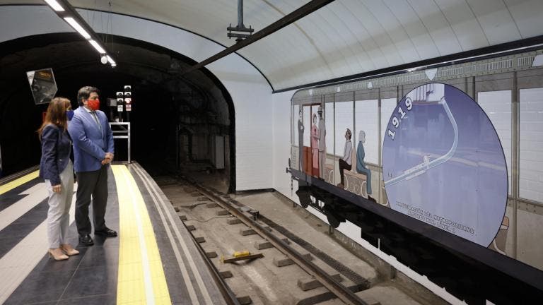 Por ello, aprovechando los trabajos de transformación, se han puesto en las vías y pasos murales de aluminio que muestran la historia de Metro y de Madrid, concretamente siete lienzos y dos pinturas. Uno de ellos ocupa el andén completo de la línea 2.