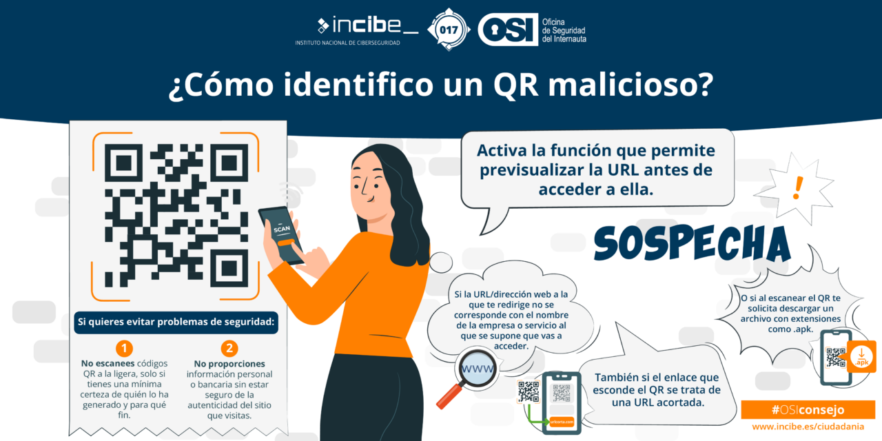 Desde el Instituto Nacional de Ciberseguridad (INCIBE) aconsejan no escanear códigos QR a la ligera y no proporcionar información personal o bancaria sin estar seguros de la autenticidad del sitio.