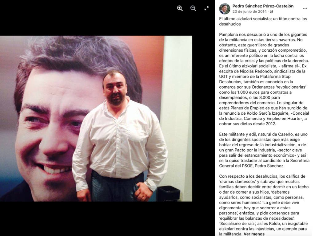 «Ex escolta de Nicolás Redondo, sindicalista de la UGT y miembro de la Plataforma Stop Desahucios», sigue la publicación del presidente del Gobierno sobre Koldo, al que presentaba entonces como «este militante y edil, natural de Caserío». «Así es Koldo, un inagotable aizkolari contra las injusticias, un ejemplo para la militancia», señalaba por entonces Sánchez.