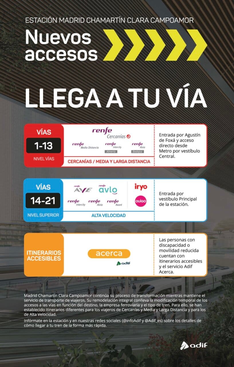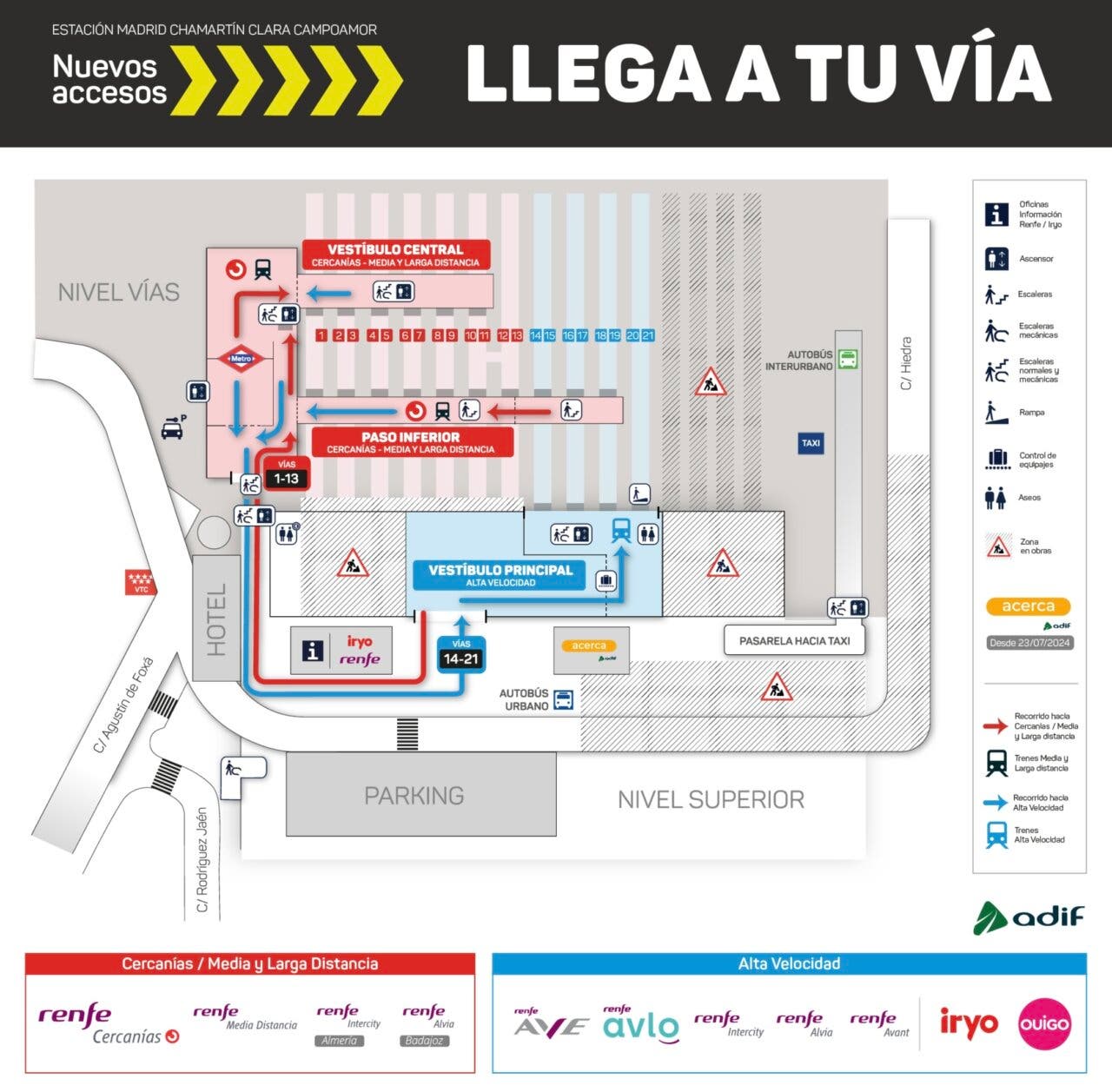 - Los viajeros de Alta Velocidad que lleguen a Chamartín y prosigan su viaje a través de Cercanías, los servicios de Media y Larga Distancia y Metro utilizarán el paso inferior para enlazar directamente con el Vestíbulo Central o Metro.