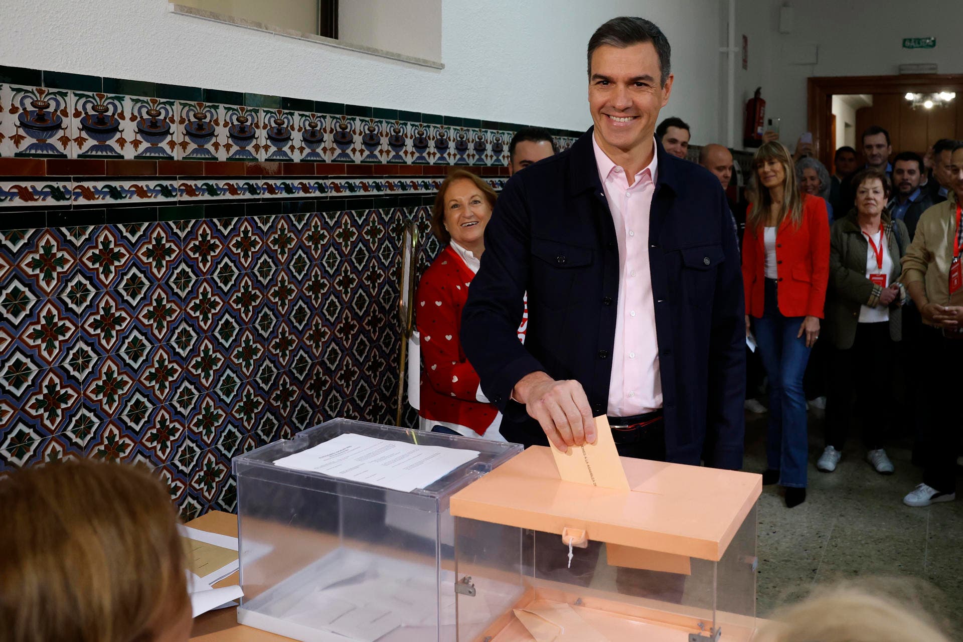 El presidente del Gobierno y secretario general del PSOE, Pedro Sánchez, ha ejercido este domingo su derecho al voto a las 9:25 horas en el colegio Buen Consejo de Madrid. El líder del PSOE ha votado acompañado por su mujer, Begoña Gómez.