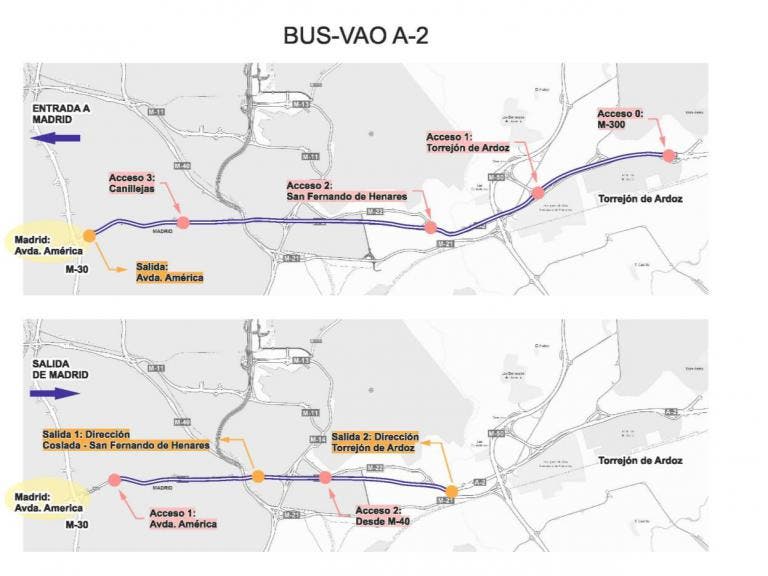 En sentido de entrada a Madrid, el acceso al carril Bus-VAO se podrá realizar desde Alcalá de Henares, Torrejón de Ardoz, San Fernando de Henares y Canillejas. La salida será en Avda. de América.