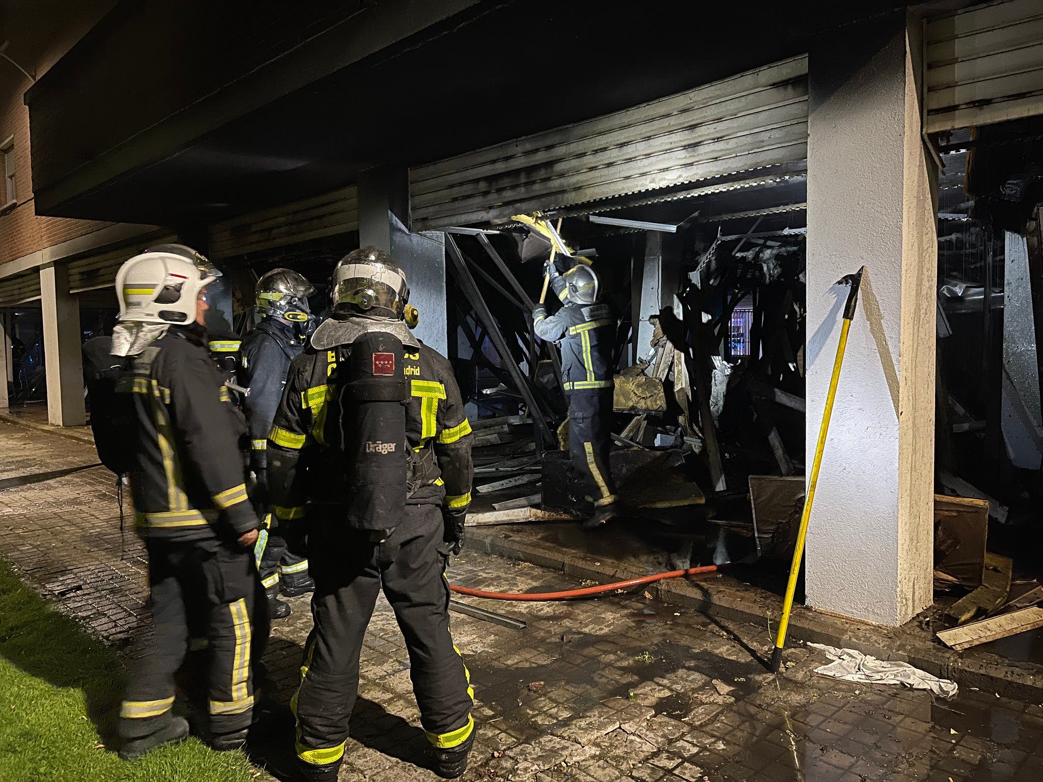 Siete dotaciones de Bomberos de la Comunidad de Madrid han extinguido esta madrugada un aparatoso incendio originado en una caseta que almacenaba herramientas y combustible en los bajos de un edificio de siete alturas en Torrejón de Ardoz.