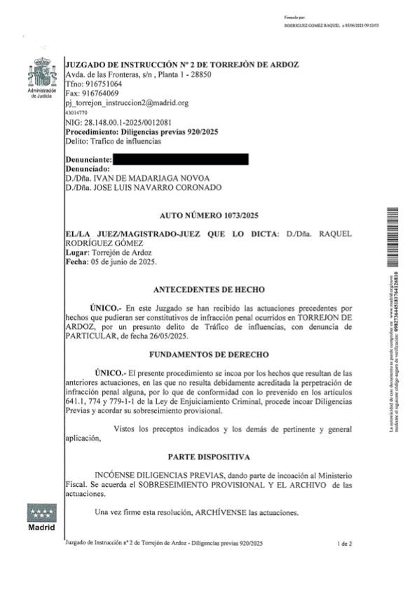 El Ayuntamiento de Torrejón de Ardoz ha informado que el Juzgado de Instrucción Nº 2 ha archivado la denuncia presentada por Manos Limpias por un presunto delito de tráfico de influencias contra dos componentes del Gobierno local, el segundo teniente de alcalde, José Luis Navarro, y el director de Seguridad por las concesiones de bares en el Parque Europa.. El motivo es que «no se aprecia infracción penal alguna», destaca el Consistorio.