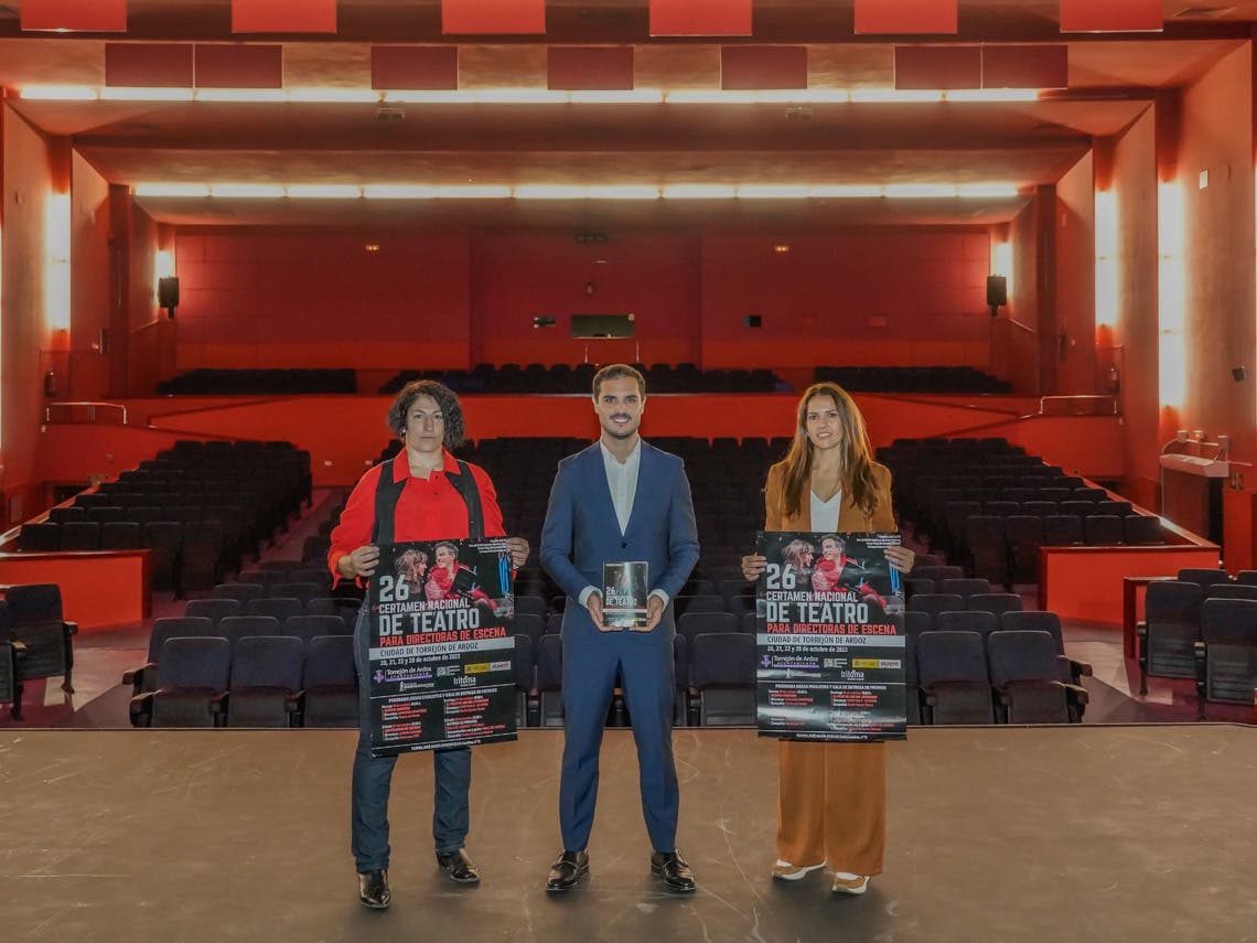 El alcalde, Alejandro Navarro Prieto, y la concejala de Igualdad y Festejos, María Eugenia Gil, y la concejala de Turismo, Miriam Gutiérrez, han presentado, en el Teatro Municipal José María Rodero, el XXVI Certamen Nacional para Directoras de Escena Ciudad de Torrejón de Ardoz que se celebrará los próximos 20, 21, 22 y 28 de octubre. Este certamen, único en España tiene el objetivo de dar visibilidad al mérito, trabajo y talento de las mujeres que se dedican a la dirección de escena.