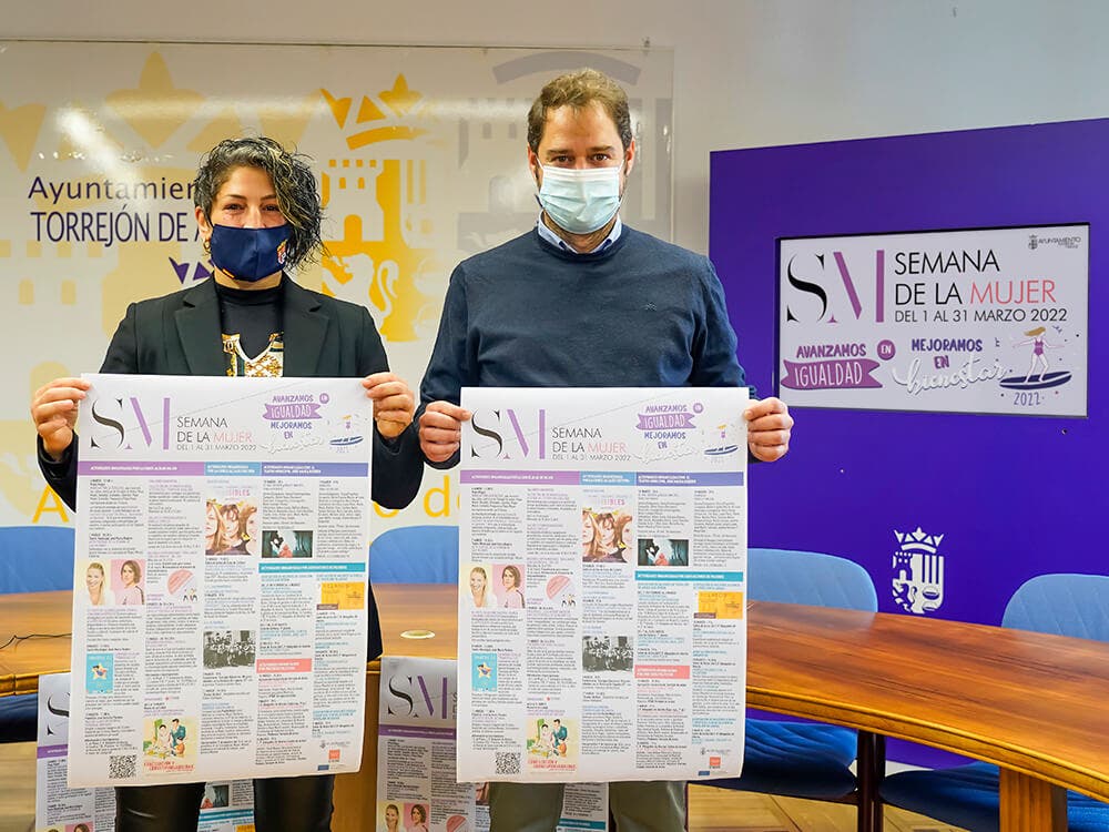 La Semana de la Mujer de Torrejón de Ardoz 2022 se celebra este año bajo el lema «Avanzamos en igualdad, mejoramos en bienestar». Para ello, el Ayuntamiento ha organizado un conjunto de actividades durante todo el mes de marzo teniendo como objetivo, la conciliación, corresponsabilidad y uso del tiempo como base fundamental para alcanzar la igualdad entre hombres y mujeres. El alcalde, Ignacio Vázquez, y la concejala de Mujer, Miriam Gutiérrez, han presentado esta mañana la amplia programación (pincha aquí para consultar toda la programación).