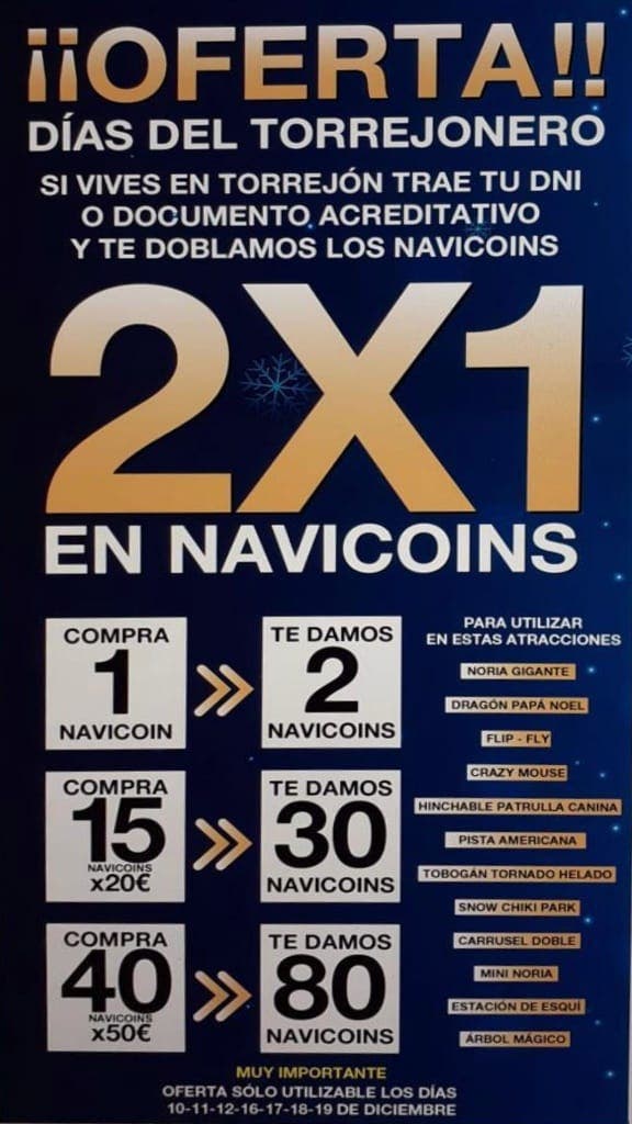 La oferta de 2x1 en los Navicoins (ticket de entrada) se podrá utilizar durante los días señalados en las siguientes 12 atracciones de pago: Noria Gigante, Tren Dragón Papá Noel, Flip Fly, Montaña Rusa Crazy Mouse, Hinchable Patrulla Canina, Pista Americana, Tornado Helado, Snow Chiquipark, Carrusel Doble Veneciano, Mini Noria, Estación de Esquí y Árbol Mágico.