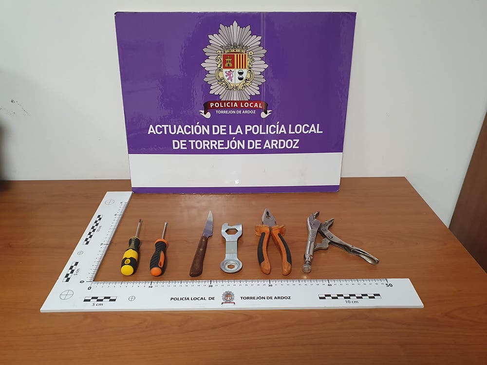 Los dos individuos fueron interceptados tras una breve persecución. Los agentes procedieron al cacheo y registro de los mismos, hallando en su posesión diversas herramientas que podrían ser utilizadas para forzar cerraduras y puertas.