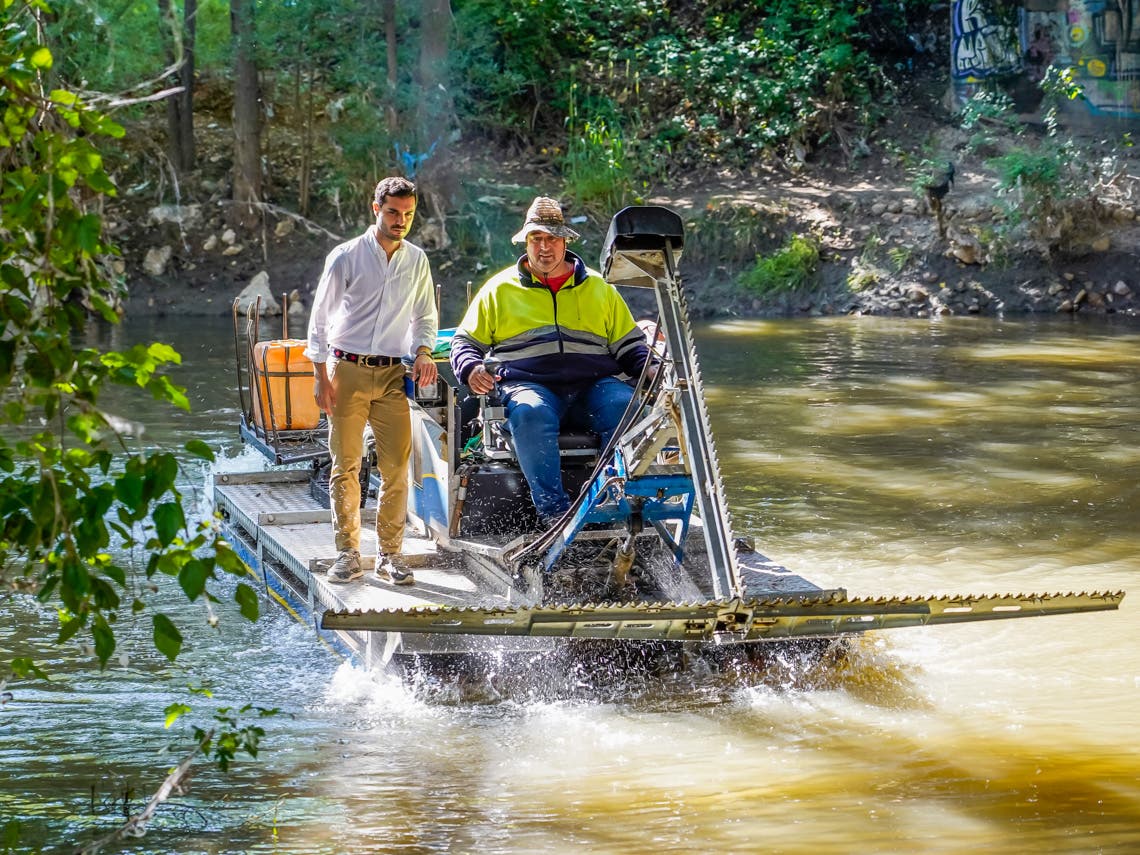 El barco anfibio de Torrejón vuelve al río Henares para luchar contra los mosquitos