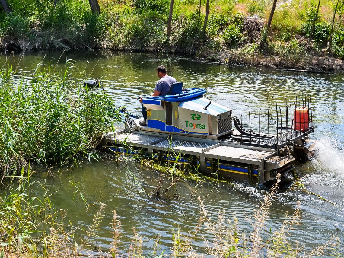 La máquina actúa sobre 7 kilómetros de cauce del río, desde la M203 (situada un poco más arriba que el Hospital) y descendiendo hasta pasado el barrio del Castillo. Se trata de una máquina anfibia, una de las pocas que hay en España, que cuenta con la tecnología más moderna traída de Suecia y dispone de una cuchilla sumergida, que va cortando unas determinadas plantas acuáticas donde anida los mosquitos, que se encuentran en el cauce del río a su paso por Torrejón.
