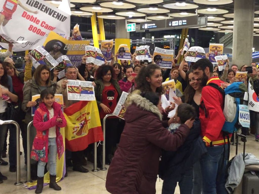 El caluroso recibimiento al atleta torrejonero, Juanjo Crespo, en Barajas