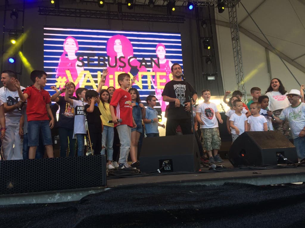 Hubo también lugar para las bromas, ya típicas, sobre su minusvalía, y el momento más emotivo de la tarde llegó cuando un grupo de niños se subió al escenario para interpretar la conocida canción Se Buscan Valientes, contra el acoso escolar.