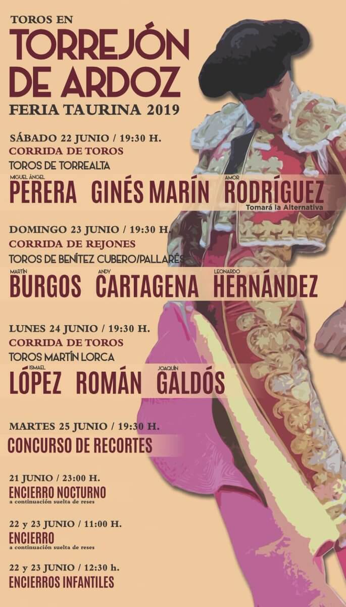 Ya ha sido presentado oficialmente el cartel taurino de las Fiestas Populares 2019 de Torrejón de Ardoz que incluye corridas, encierros y concurso de recortes. Las corridas de toros, rejones y recortes comenzarán a las 19.30 horas.