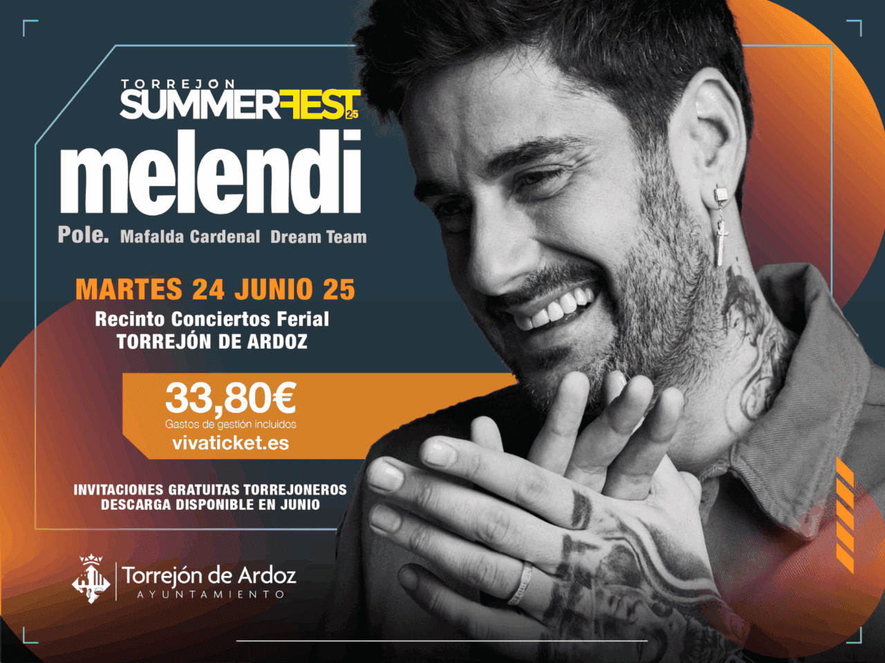 Melendi ofrecerá un concierto muy especial el martes 24 de junio en Torrejón de Ardoz, dentro del Torrejón Summer Fest 2025-Fiestas Populares. Las entradas ya están disponibles al precio de 33,80 euros, gastos de gestión incluidos, en el siguiente enlace: Comprar entradas Melendi.