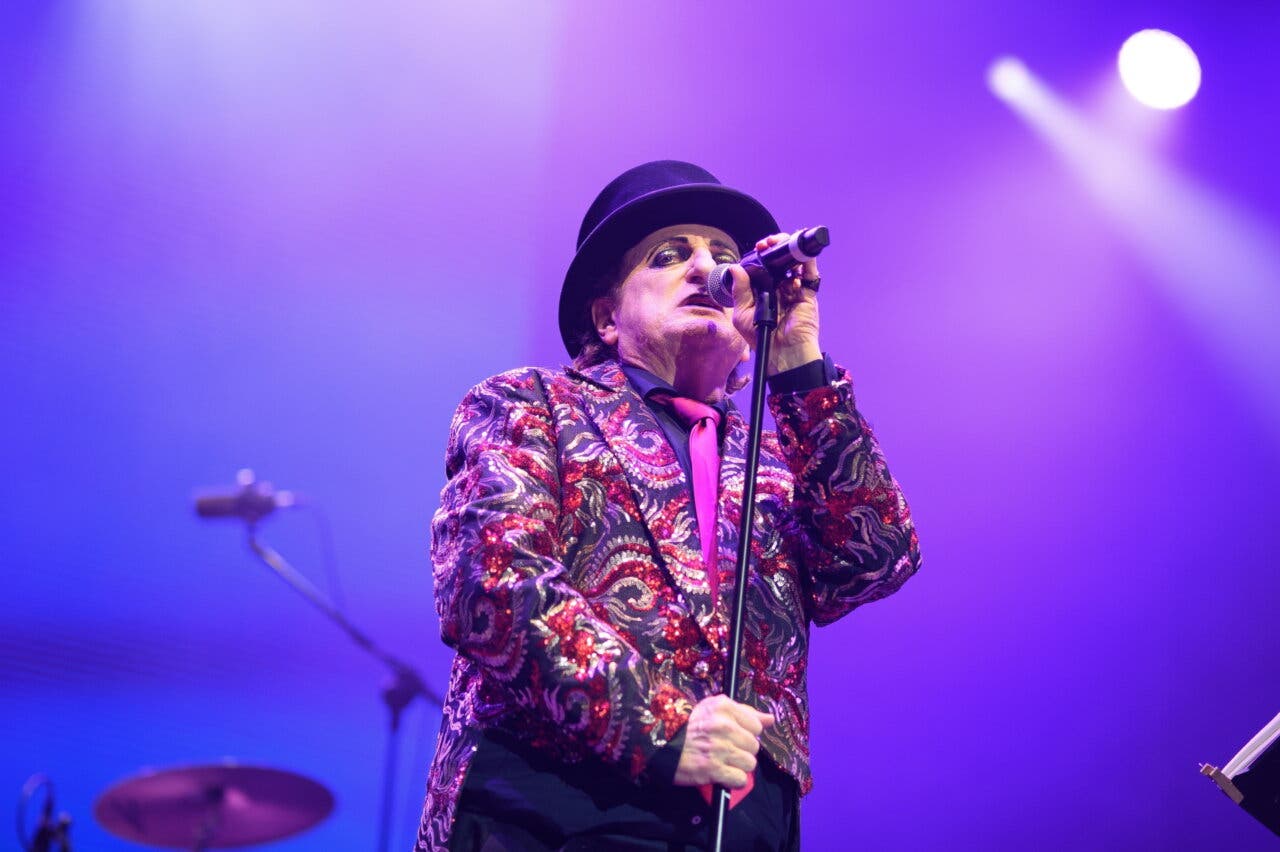 Singer Javier Gurruchaga of the Mondragon Orchestra performs during the concert in Madrid's Plaza Mayor on May 15, 2025, in Spain.