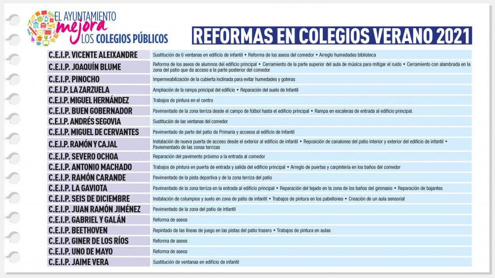 Continuando con el programa El Ayuntamiento Mejora los Colegios Públicos se han realizado durante el verano estas reformas en los colegios públicos de la ciudad para que sus instalaciones estén en unas condiciones lo más adecuadas posibles cuando comience el nuevo curso escolar.