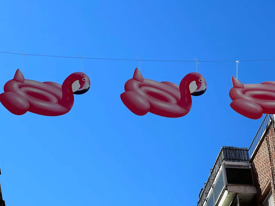 Flotadores flamencos decoran la calle Enmedio de Torrejón de Ardoz este verano