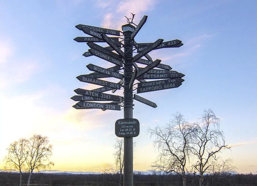 Monument of the Northernmost of Sweden: situado en Karesuando, la localidad más septentrional del país, indica las distancias a diferentes puntos emblemáticos del mundo. En la réplica, no faltaría la distancia a Torrejón de Ardoz, señalan desde la compañía sueca.