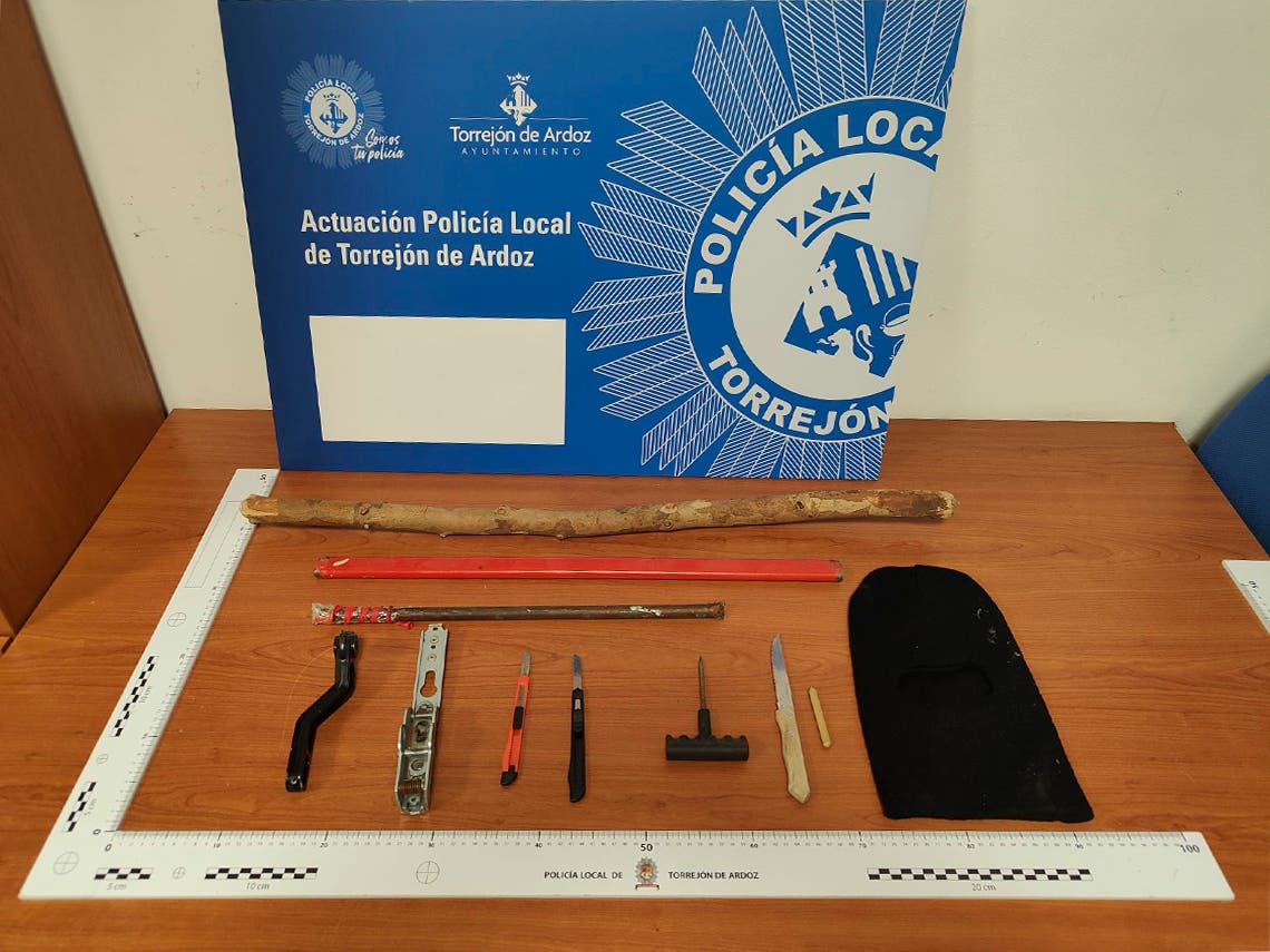 Durante la intervención, los agentes encontraron en diversos escondites de los portales, además de un cuchillo, un pasamontañas, dos barras de hierro, un palo de madera de grandes dimensiones, dos objetos metálicos de grandes dimensiones, dos cúteres y dos punzones, todos ellos, objetos susceptibles de ser usados en actos delictivos o para amenazar y amedrentar a los vecinos.