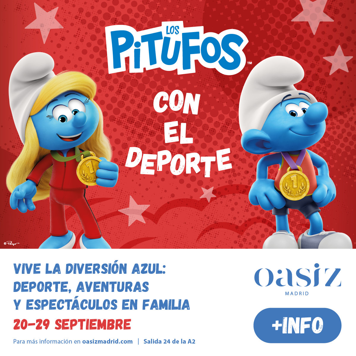 Este otoño, los icónicos Pitufos llegan al resort comercial de Torrejón de Ardoz Oasiz Madrid con su evento oficial Los Pitufos con el Deporte. Del 20 al 29 de septiembre, el centro comercial se transformará en un universo mágico lleno de actividades deportivas, juegos, espectáculos y mucha diversión para toda la familia.