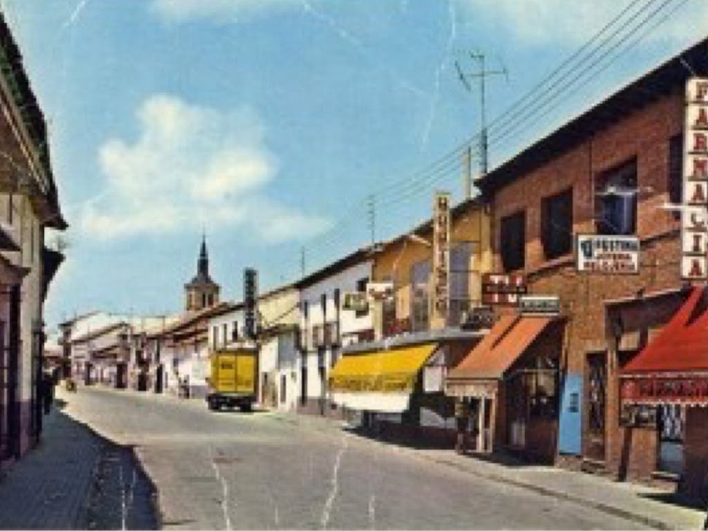 En la imagen se pueden ver a continuación casas particulares. Y a la altura del camión amarillo había un baile. En la acera de enfrente se puede ver la R del bar Sacristán, que hoy sigue abierto, al que todos los torrejoneros siempre han llamado el bar de las patatas bravas.