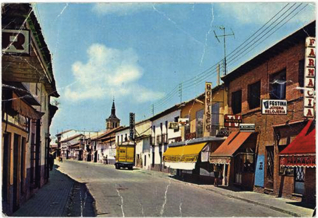 En la imagen se pueden ver a continuación casas particulares. Y a la altura del camión amarillo había un baile. En la acera de enfrente se puede ver la R del bar Sacristán, que hoy sigue abierto, al que todos los torrejoneros siempre han llamado el bar de las patatas bravas.