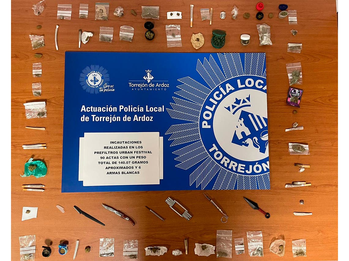 La Policía Local de Torrejón de Ardoz realizó 90 actas de incautación de estupefacientes y requisó 6 armas blancas en los controles de acceso al Urban Festival el pasado fin de semana, ha informado este jueves el Ayuntamiento de la localidad.