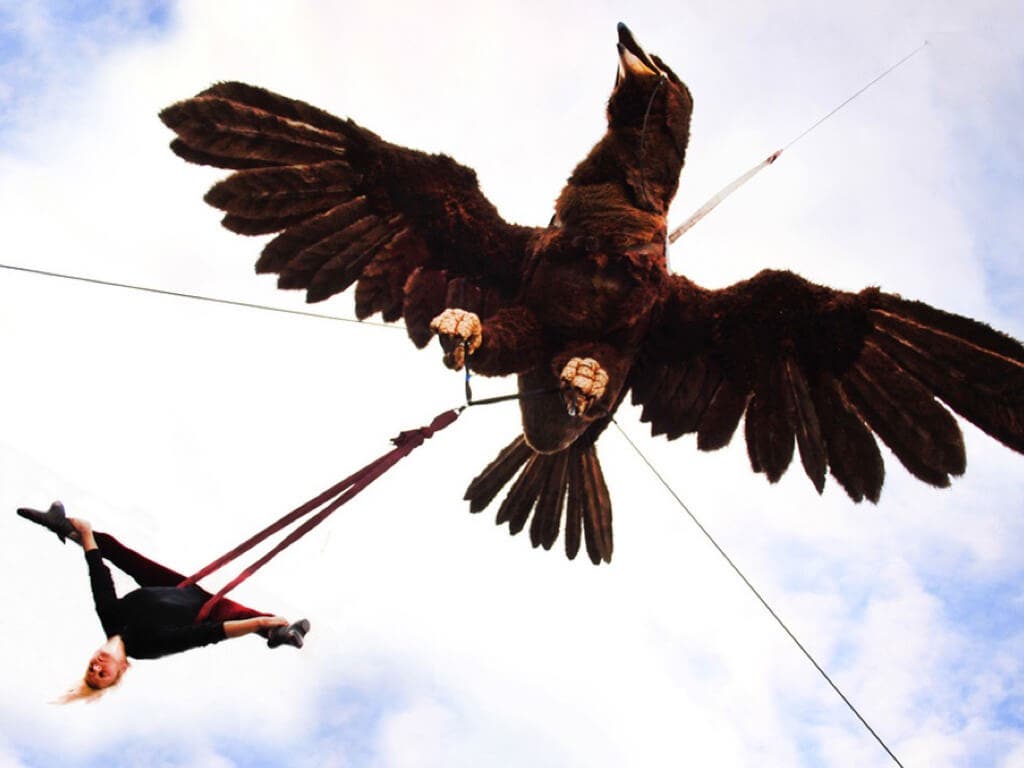 El Águila Sofía es una gran marioneta suspendida en el aire que impresiona nada más verla y que va acompañada de acróbatas y un séquito de artistas.