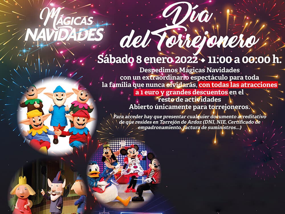 Mañana sábado 8 de enero se celebra el Día del Torrejonero para despedir el parque Mágicas Navidades con las atracciones a 1 euro y grandes espectáculos cómo CantaJuego, Magic Dreams, Ben y Holly y los Guachis. El broche de oro será un pase especial de la Puerta Mágica con fuegos artificiales y la mejor música del momento (dirigido a niños y adultos).