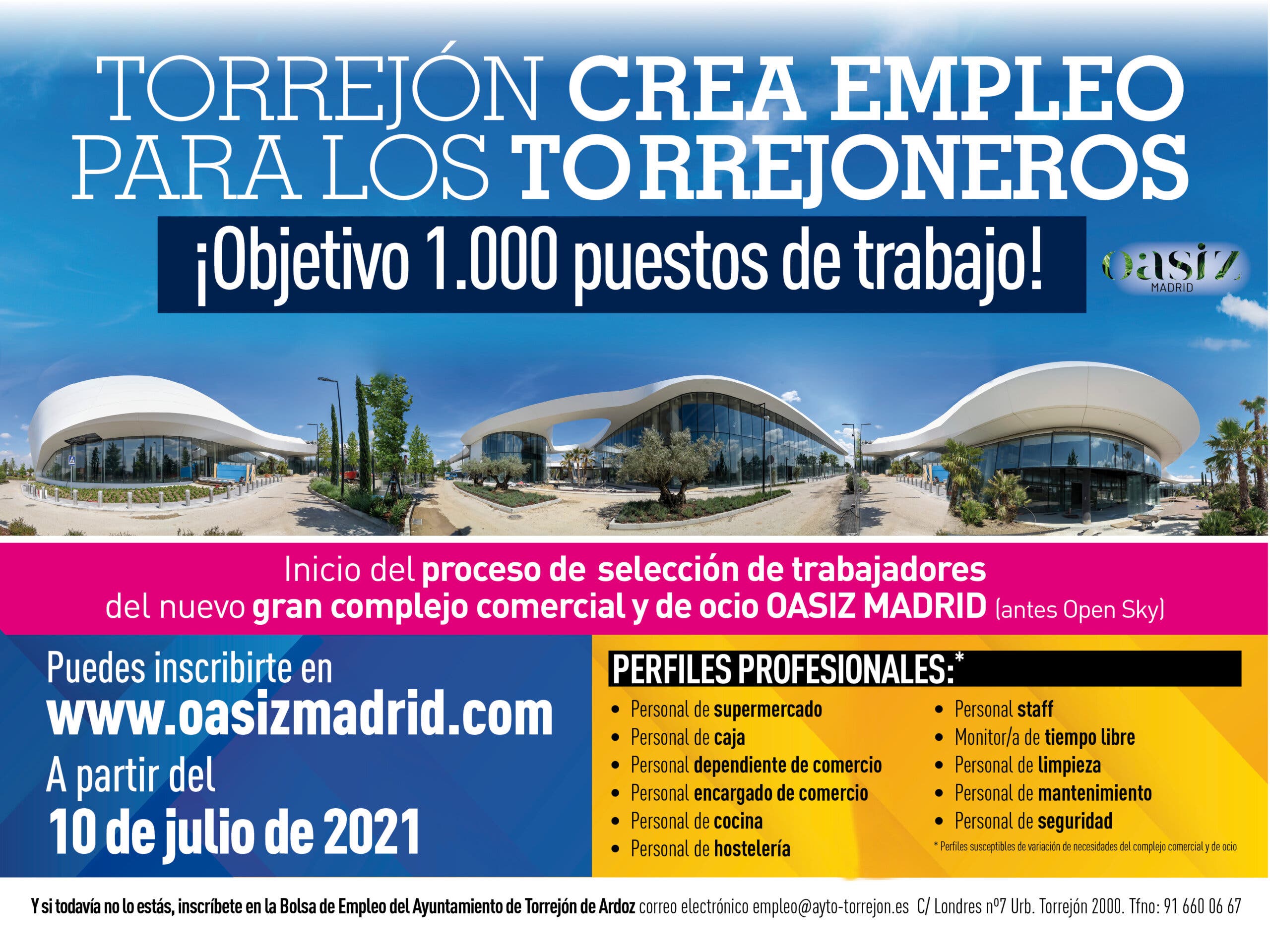El Ayuntamiento de Torrejón de Ardoz ha anunciado este jueves el inicio del proceso de selección de trabajadores por parte de la empresa promotora del nuevo complejo comercial y de ocio Oasiz Madrid, antes llamado Open Sky, que espera abrir sus puertas en la segunda quincena de septiembre.